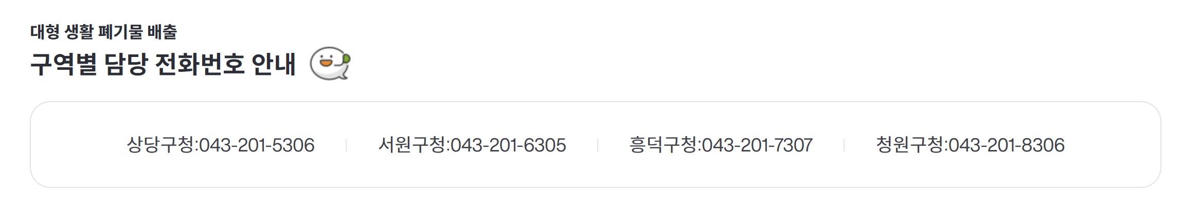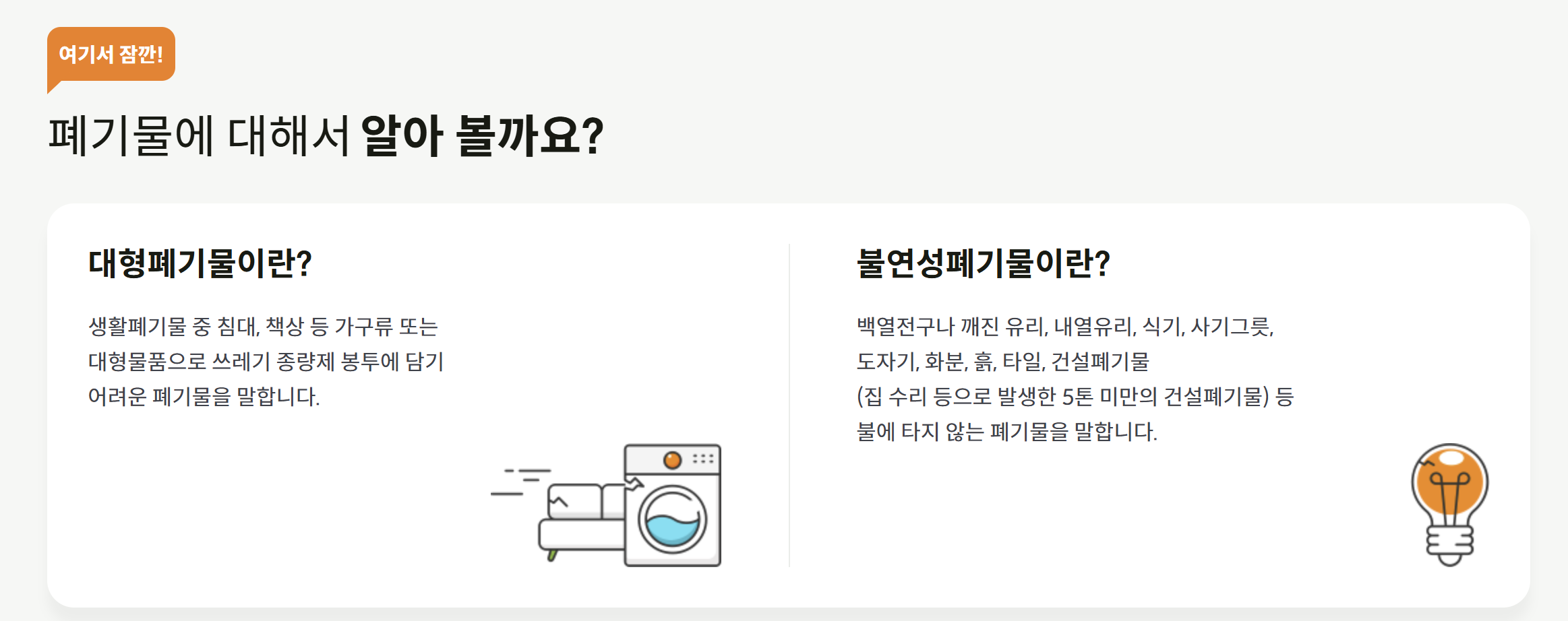 또한, 불연성 폐기물도 있죠? 말 그대로 불에 타지 않는 백열전구나 깨진 유리, 내열유리, 식기, 사기그릇, 도자기, 화분, 흙, 타일, 건설폐기물(집 수리 등으로 발생한 5톤 미만의 건설폐기물) 등 불에 타지 않는 폐기물을 말합니다. 이런 폐기물 모두를 청주시 대형폐기물 관리 시스템에서 배출 신청하실 수 있으십니다.